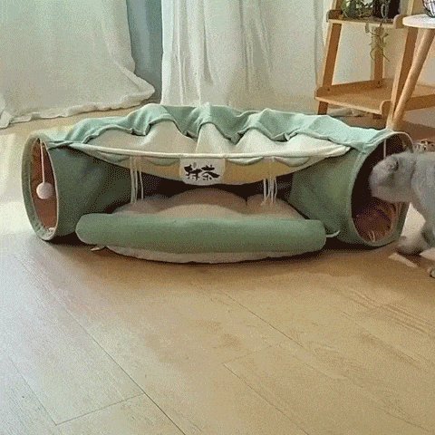 Dreamsoule cat tunnel bed is a perfect combination of toy tunnel and cat bed, built-in sound paper and toys, Add more fun. Cat Tunnel is ideal for interactive activity. such as hide and seek. Mat also great for nap when they feel like rest.